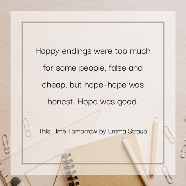 This Time Tomorrow, by Emma Straub, is a time travel novel. Alice works in admissions in her former New York City school and loves her best friend and her apartment and her father, who is slowly dying in the hospital. She goes to bed on the night of her 40th birthday, and wakes up in 1996, on her 16th birthday. The most surprising part of her former life is her father–young, healthy, vibrant. With the wisdom of her 40 years, what would she tell her 16 year old self? What would she tell her father? The book is a love letter to fathers, to writing (her father is a time-travel novelist), and to New York. I loved living in the pages of this story, and the quotes listed here show some themes from the book that completely reflect my ideal reading experience. This book covered them all.